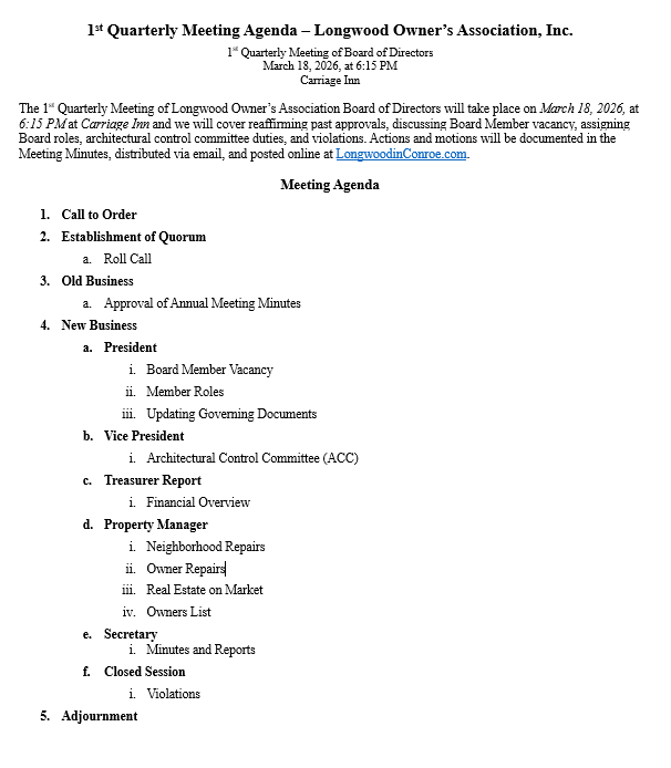 The 1st Quarterly Meeting of Longwood Owner’s Association Board of Directors will take place on March 18, 2026, at 6:15 PM at Carriage Inn.